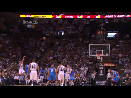而2012年的西區冠軍賽第一場,馬刺遇上了雷霆,同樣是AT & T Center,Ginobili則在Fisher的眼前,表演了和當年幾乎一模一樣的進球——只是時間比較多、距離也比較長。