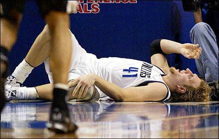 經過兩年的厲兵秣馬,小牛已經是西區一級強隊。這年馬刺和小牛以60勝的成績,分列西區第一、第三種子,馬刺在第二輪淘汰了三連霸的湖人,而小牛則轟垮了攻勢如水銀瀉地般的國王,兩軍在西區冠軍賽碰頭。前兩戰在馬刺主場戰成1-1平手,第三戰回到達拉斯,小牛卻一路被馬刺壓著打。然而,就在終場前7分45秒,馬刺取得80-66領先時,Nowitzki在沒有肢體碰觸的情況下倒地,膝蓋受傷離場。